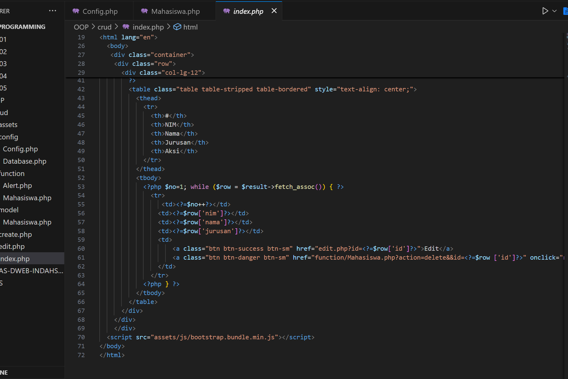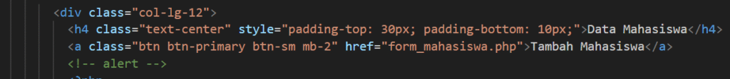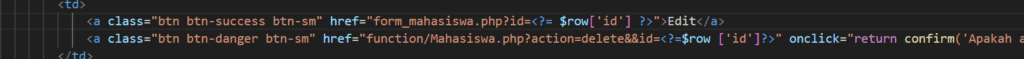 Pada index, disesuaikan juga seperti ini agar saat ditekaan tombol tambah dan edit maka akan menuju ke laman form_mahasiswa.php.