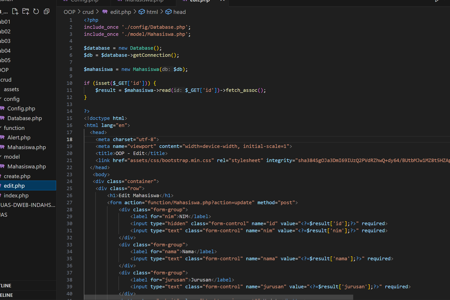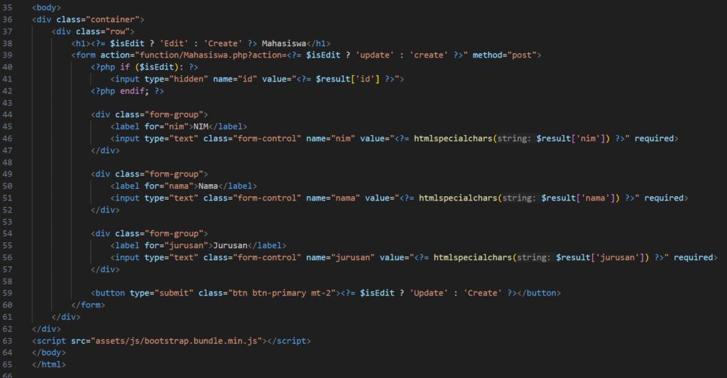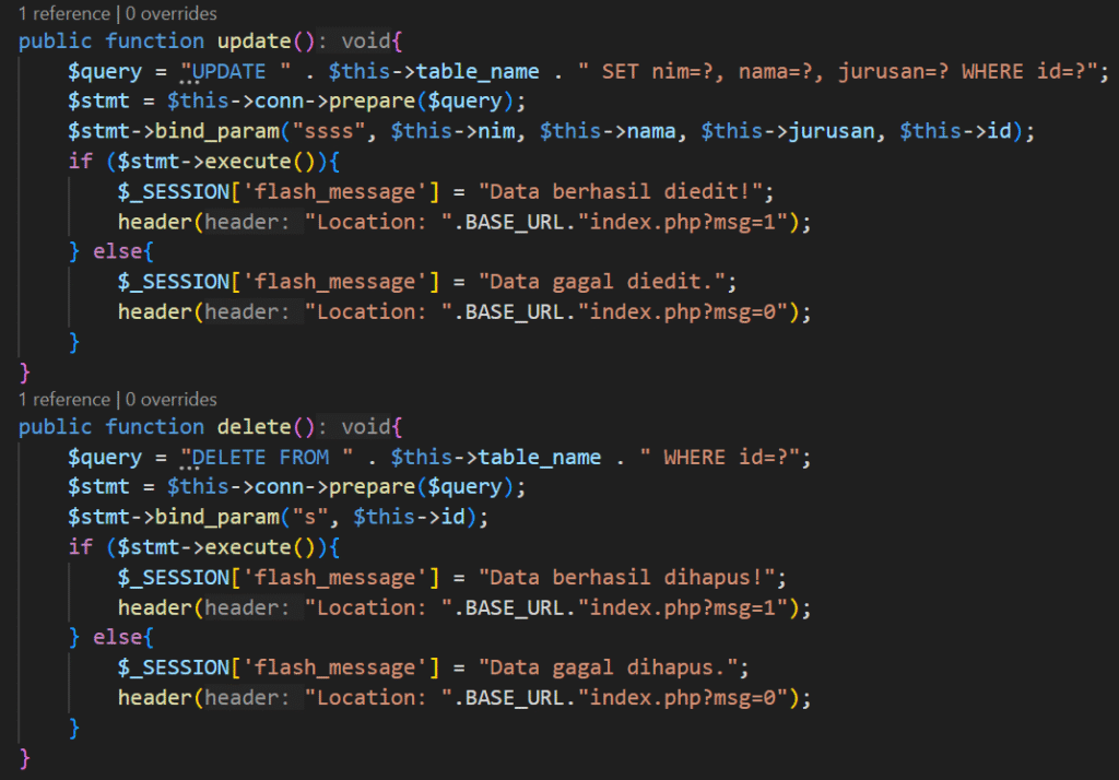 Kode ini adalah halaman form dinamis untuk menambahkan (create) atau mengedit (update) data mahasiswa tergantung pada ada atau tidaknya parameter id di URL. Pertama, script memuat file koneksi database (Database.php) dan model mahasiswa (Mahasiswa.php), lalu membuat objek koneksi database dan objek Mahasiswa. Jika ada parameter id pada URL, maka dianggap mode edit dan data mahasiswa diambil berdasarkan id untuk ditampilkan di form, serta action form diarahkan ke proses update. Jika tidak ada id, maka form berjalan dalam mode create dengan field kosong dan action diarahkan ke proses create. Form ini menampilkan input untuk NIM, nama, dan jurusan, serta tombol submit yang teksnya akan berubah sesuai mode-nya (Create atau Update). Kode juga menggunakan fungsi htmlspecialchars() untuk menghindari potensi XSS saat menampilkan nilai di form.