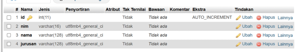 Buat database baru dengan nama pemrograman_web, lalu buat tabel mahasiswa dengan 4 kolom, yakni ID, nama, NIM, dan jurusan, sehingga akan terlihat seperti ini di database.
