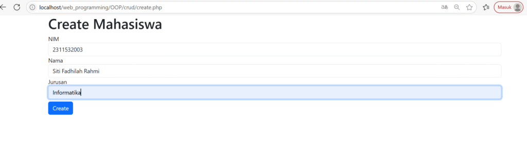 Terakhir, buat file bernama create.php dalam folder CRUD tadi yang berisi form inputan untuk memambahkan data mahasiswa.