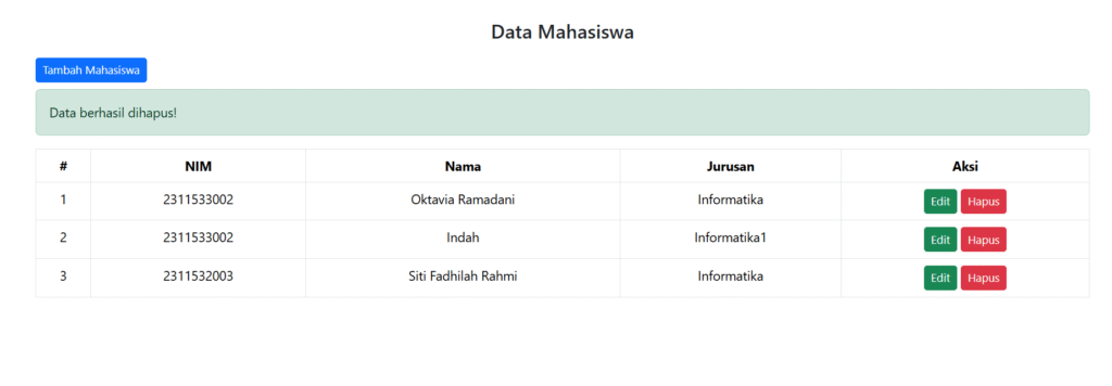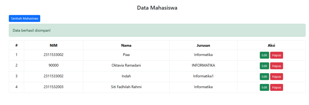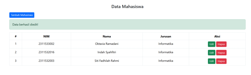 File ini berfungsi sebagai halaman utama untuk menampilkan data mahasiswa dari database dalam bentuk tabel. Pada bagian awal, file menghubungkan ke database dan memanggil method untuk mengambil data mahasiswa. Jika terdapat pesan dari sesi sebelumnya, seperti notifikasi sukses atau gagal saat menambah, mengedit, atau menghapus data, pesan tersebut akan ditampilkan sebagai alert. Di tabel, data mahasiswa ditampilkan dengan kolom NIM, Nama, dan Jurusan, serta terdapat tombol aksi untuk mengedit dan menghapus data mahasiswa. Tombol tambah mahasiswa mengarahkan ke halaman form input data baru. Saat tombol hapus diklik, pengguna akan diminta konfirmasi sebelum data dihapus.