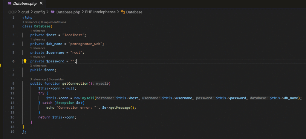 Kode ini digunakan untuk membuat koneksi ke database MySQL menggunakan OOP di PHP. File ini merupakan class Database yang punya method getConnection() untuk menghubungkan website ke database pemrograman_web.