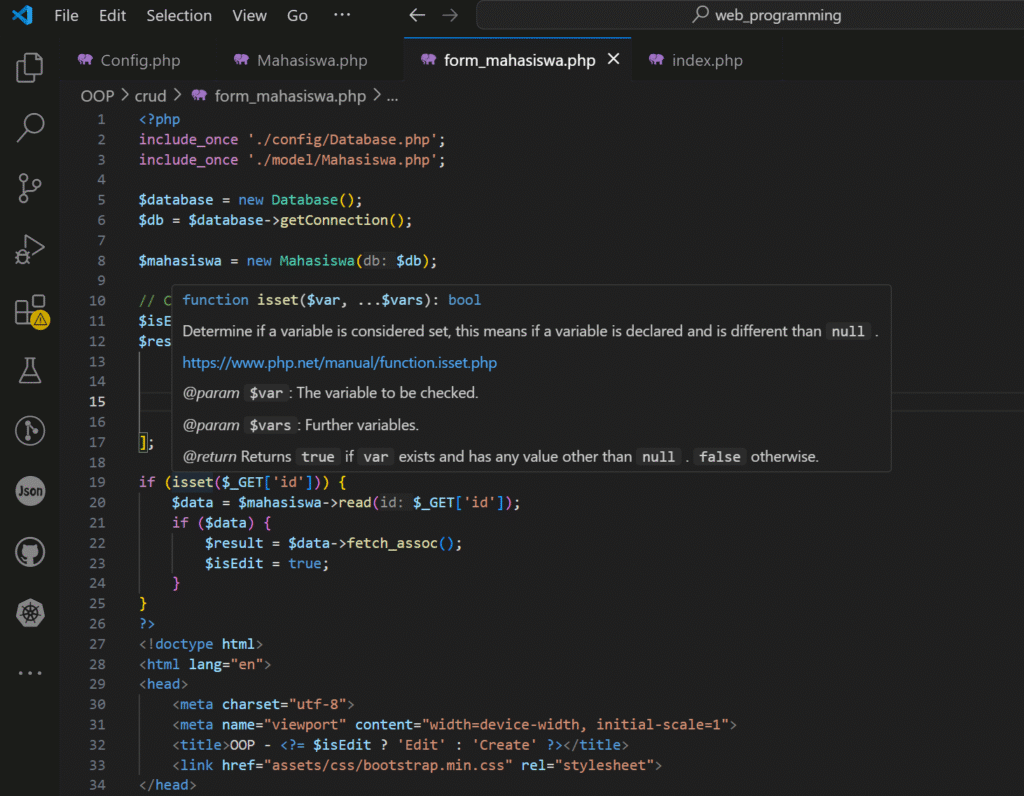 Pada praktikum ke-6 mata kuliah pemrograman web semester 4 jurusan informatika, saya mempelajari dan mencobakan bagaimana membuat CRUD sederhana dengan konsep Object Oriented Programming (OOP) atau PBO dengan php dan MySQL di VS Code. Kali ini, saya akan memaparkan seluruh langkah-langkah yang harus dilakukan untuk membuat CRUD sederhana mengenai data mahasiswa.