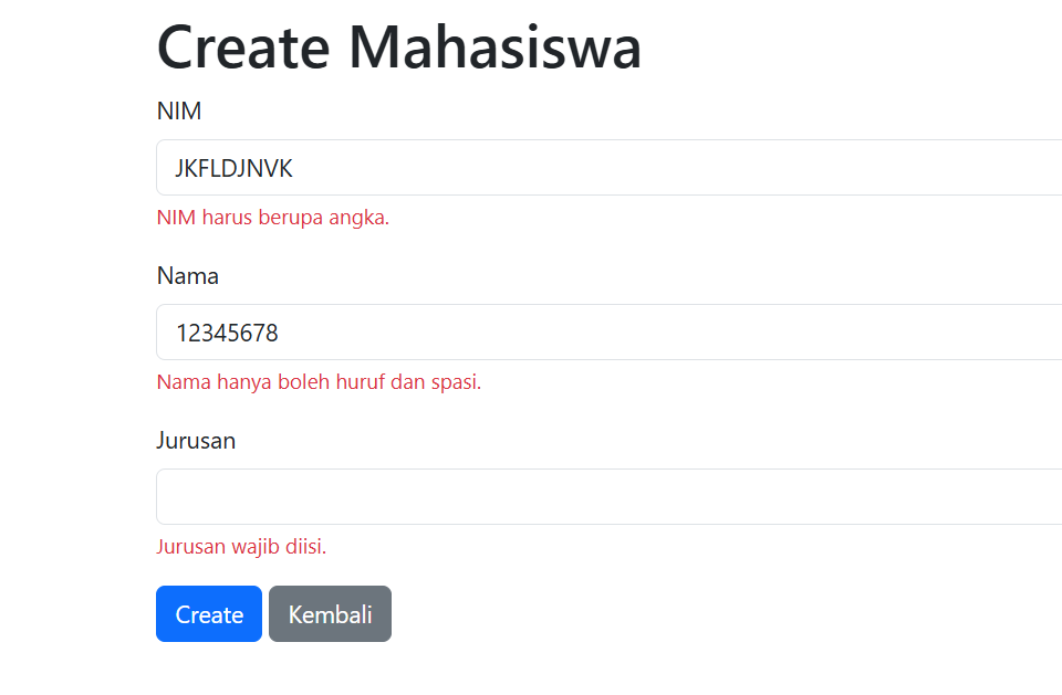 Selanjutnya, validasi dilakukan satu per satu. Untuk nim, dicek apakah input kosong atau bukan angka murni menggunakan regex /^\d+$/. Jika tidak valid, akan muncul pesan error dan valid diubah menjadi false. Hal serupa dilakukan untuk nama dan jurusan, dengan regex /^[a-zA-Z\s]+$/ untuk memastikan hanya huruf dan spasi yang diizinkan. Jika ada satu saja field yang tidak valid, maka e.preventDefault() akan dipanggil di bagian akhir fungsi untuk mencegah form dikirim ke server, sehingga pengguna dapat memperbaiki inputnya terlebih dahulu.