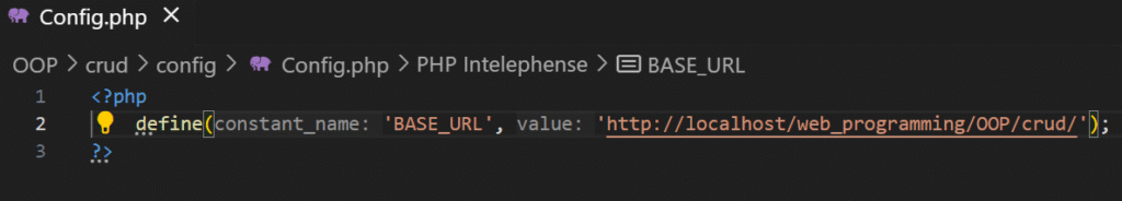 Selanjutnya, buat file Config.php dalam folder config. Ini adalah file yang digunakan untuk menyimpan variabel konstan seperti alamat utama (URL dasar) dari proyek website (dalam kode yakni BASE_URL). Dengan adanya config dan BASE_URL, kita bisa memanggil alamat dasar ini di berbagai file dalam proyek tanpa harus menuliskannya berulang-ulang. Hal ini memudahkan pengelolaan dan perubahan URL jika suatu saat diperlukan.