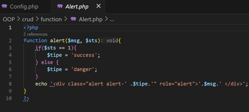 Kemudian, buat folder function dan buat file Alert.php. Ini digunakan untuk membuat fungsi yang memberikan feedback berupa pesan kepada pengguna saat beroperasi dengan data. Ada 2 argument statement, yaitu $msg yang berisi pesan dan $sts yang berisi kode. Jika status = 1, maka pesan berhasil, namun jika 0 maka pesan gagal. Berikut kode program fungsi alert.
