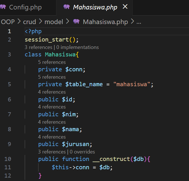 Selanjutnya, buat folder model lalu tambah file baru dengan nama Mahasiswa.php. Class (yang dibuat untuk mewakili data tabel mahasiswa) ini dibuat untuk membuat fungsi operasi CRUD. Pertama-tama, tambahkan kode untuk memulai sesi dengan session_start() dan deklarasikan variabel yang terlibat dan digunakan sebagai berikut. Fungsi construct di baris bawah adalah kode untuk memanggil koneksi database dari MySQL