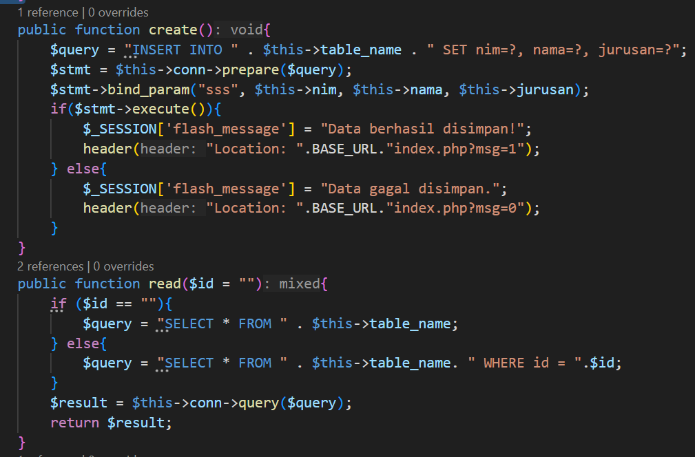 Fungsi read memiliki default parameter $id yang berisi string kosong, jika $id == “” maka akan mengeksekusi kueri untuk menampilkan seluruh data mahasiswa, jika $id !== “” maka akan mengeksekusi kueri untuk menampilkan data mahasiswa berdasarkan id mahasiswa. Berikut kode