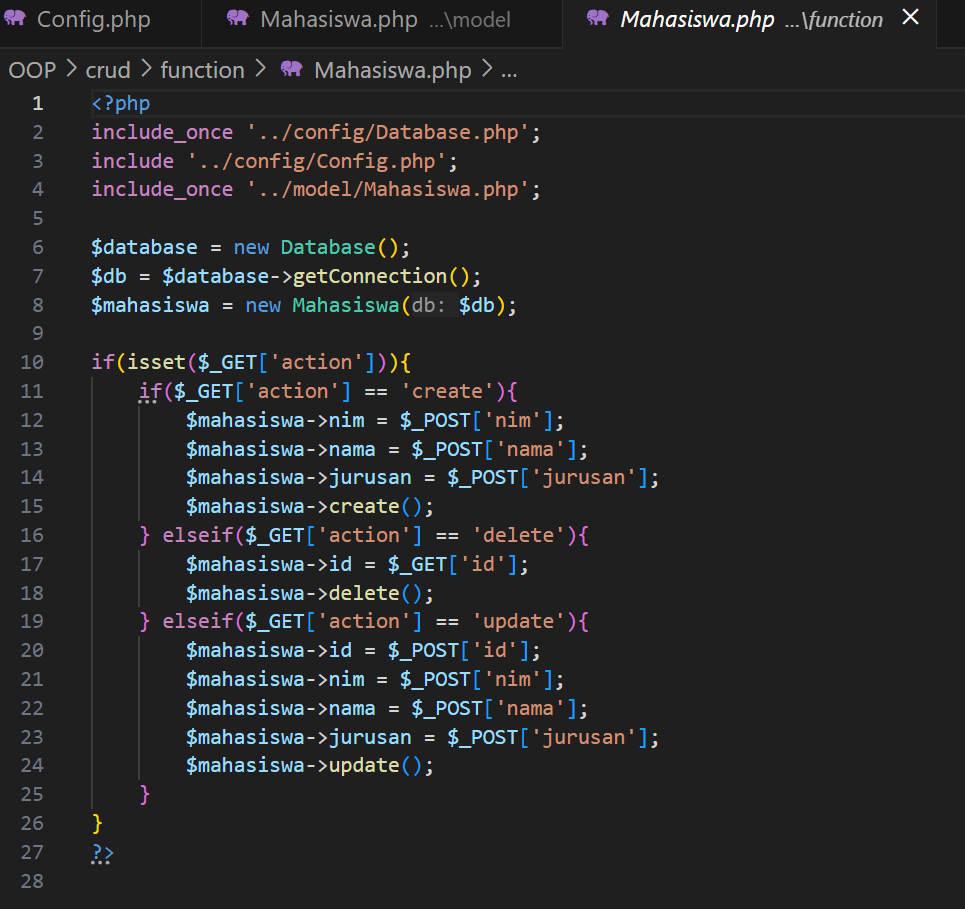 Pertama akan dilakukan pengecekan sebuah parameter action yang dikirimkan melalui method GET, jika ada terdapat parameter action yang dikirimkan maka nilai parameter akan diambil dan digunakan sesuai dengan fungsinya. Singkatnya, kode ini tidak hanya mengambil koneksi ke database, namun juga membuat objek Mahasiswa dengan koneksi tersebut. Jika action=create, data dari form disimpan ke database. Jika action=update, data diubah berdasarkan id. Jika action=delete, data dihapus berdasarkan id.
