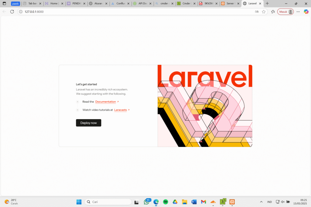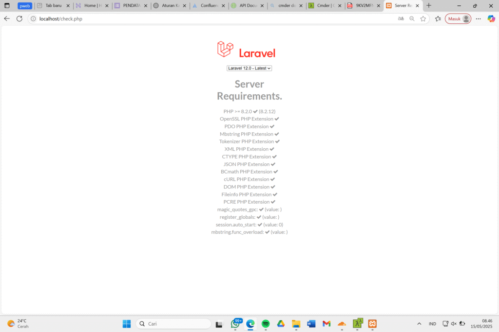 Setelah semuanya terpasang dengan benar, kita bisa pergi ke laman localhost berikut untuk mengecek apakah semua persyaratan yang dibutuhkan untuk memasang Laravel 12 terpenuhi sehingga bisa dipasang.