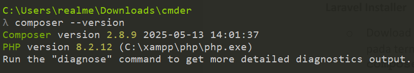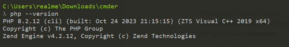 Perintah php –version digunakan untuk mengecek versi PHP yang terpasang di sistem. Dari hasil yang ditampilkan, diketahui bahwa PHP versi 8.2.12 telah berhasil terinstal. Perintah ini berguna untuk memastikan bahwa PHP sudah terinstal dengan benar, mengetahui versi PHP yang digunakan (yang penting untuk kompatibilitas dengan Laravel versi terbaru yang membutuhkan minimal PHP 8.1), serta melihat informasi build seperti compiler yang digunakan, dalam hal ini Visual C++ 2019.