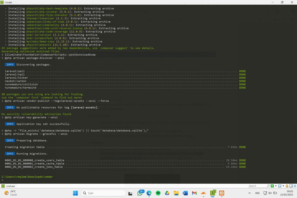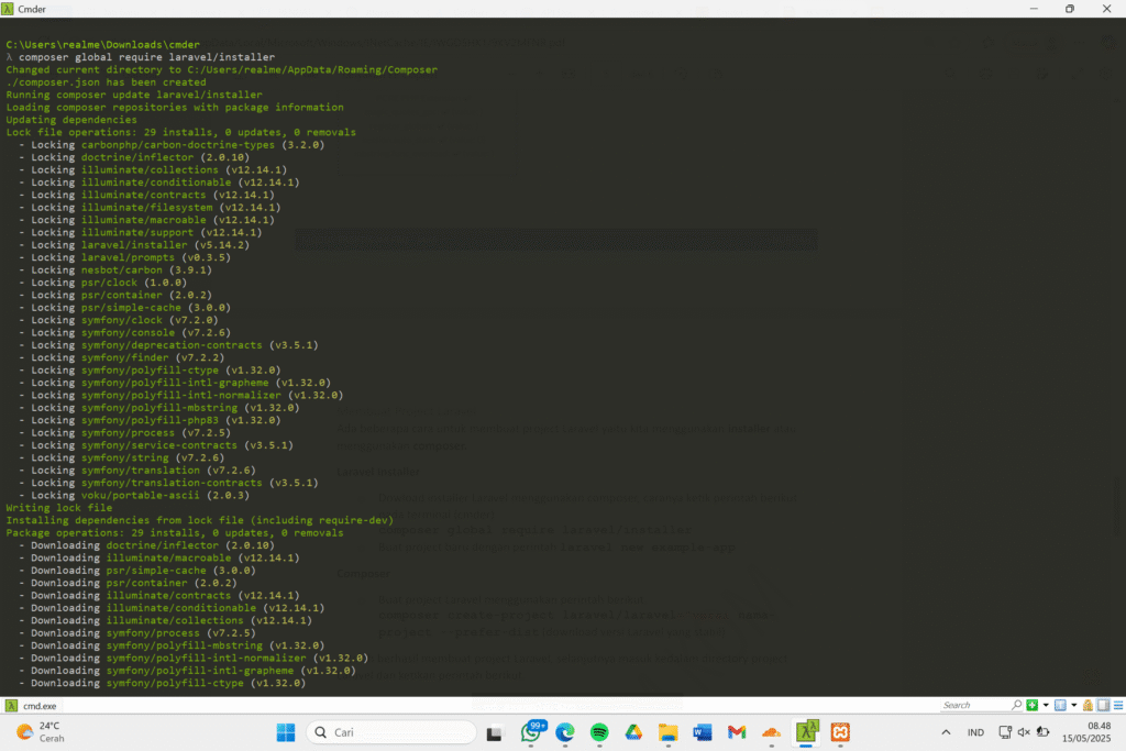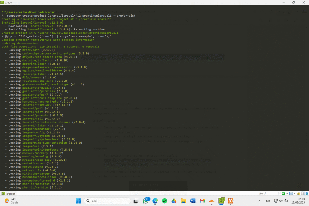 Saya menggunakan cara kedua, dengan membuat folder bernama praktikumlaravel1, untuk tampilannya di Cmder yakni sebagai berikut.