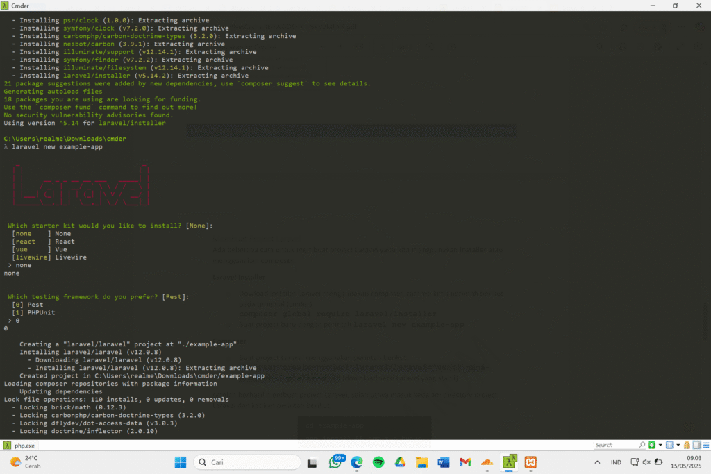 Cara kedua, kita dapat membuat proyek Laravel dengan perintah berikut: