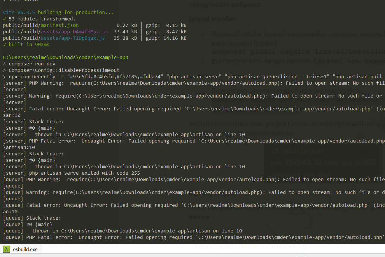 Setelah berhasil membuat proyek Laravel, selanjutnya masuk ke dalam direktori project Laravel dan mengetikkan perintah berikut untuk memasang NPM dan running NPM secara langsung bersamaan dengan perubahan kode yang otomatis dijalankan.