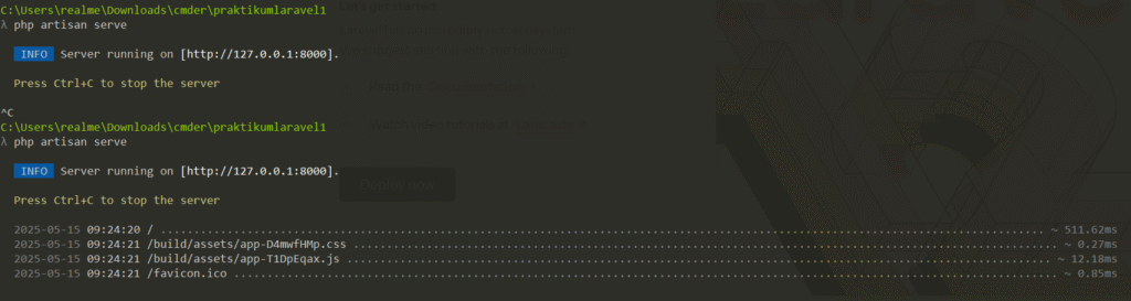 Lanjut, kita dapat mengetik perintah php artisan serve untuk melihat server dijalankan di mana.