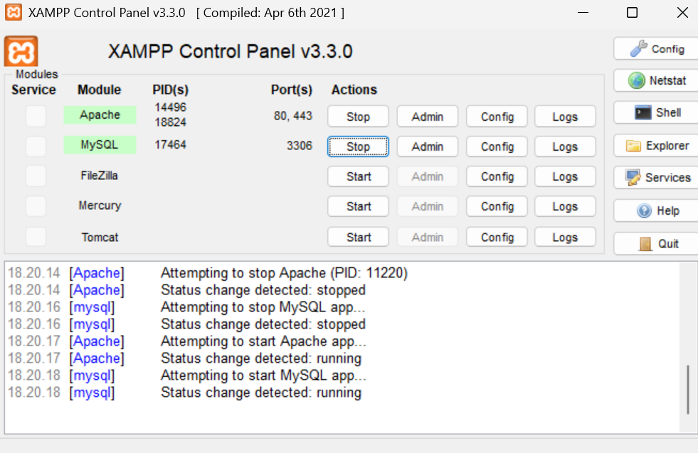 Setelah Cmder terpasang, kita lanjut memasang XAMPP dengan mengikuti langkah-langkahnya. Setelah berhasil, maka akan muncul folder htdocs secara default pada C:\xampp\htdocs yang nantinya akan digunakan untuk membuat proyek-proyek Laravel. Dengan memasang XAMPP, maka secara otomatis webserver apache, PHP, dan phpMyAdmin juga telah terpasang. Untuk terhubung dengan database, maka tampilan XAMPP yang sudah terpasang harus seperti ini.