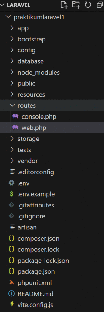 Setelah langkah-langkah tersebut selesai, kita bisa buka VS Code dengan nama folder yang sudah dibuat di Cmder tadi. Jika berjalan dengan benar, maka tampilan struktur folder yang sudah terpasang Laravel akan seperti berikut.