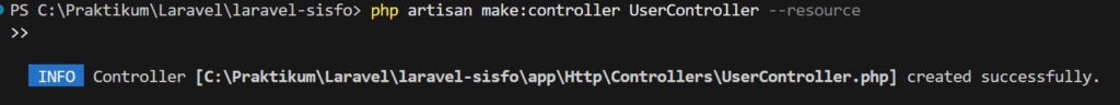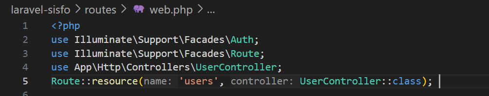 Selanjutnya yakni membuat fitur manajemen users. Kita akan menggunakan fungsi keseluruhan CRUD, maka kita akan membuat controller resource dengan buka terminal kemudian ketikkan perintah php artisan make:controller UserController –resource selanjutnya, tambahkan kode program berikut pada route web.