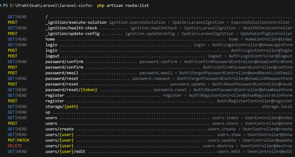 Sehingga, jika dilihat pemetaan route php artisan route:list menjadi seperti gambar di bawah ini.