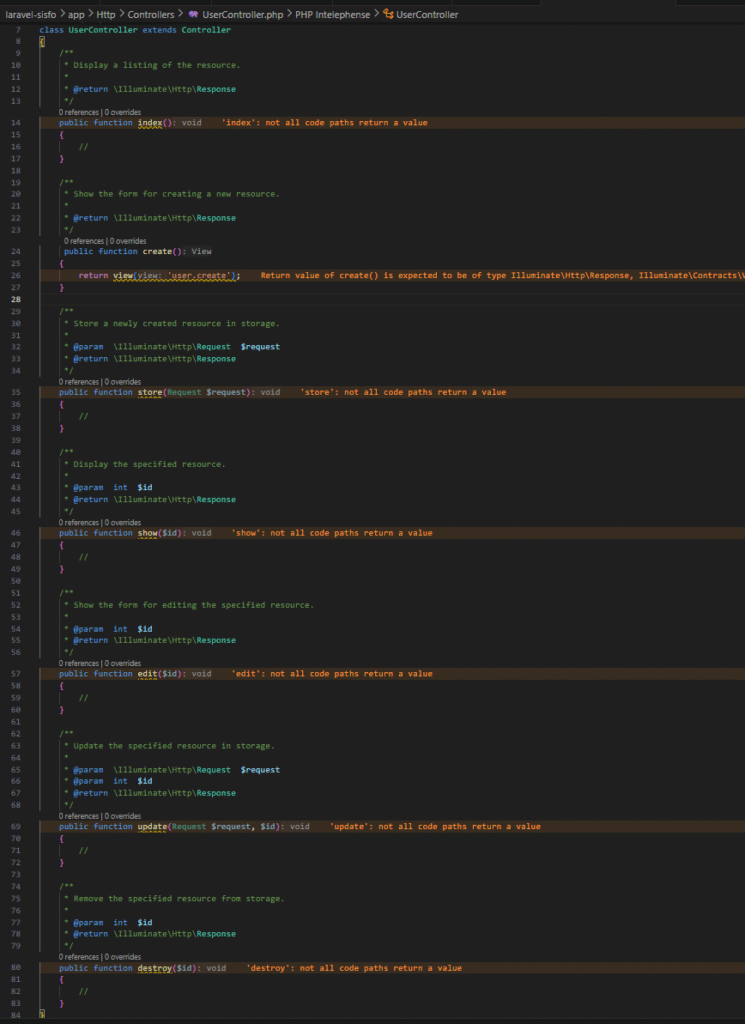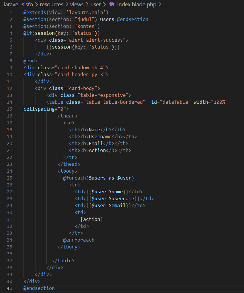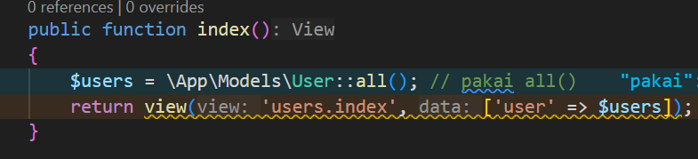 merupakan action index pada UserController, buka action index kemudian edit menjadi seperti