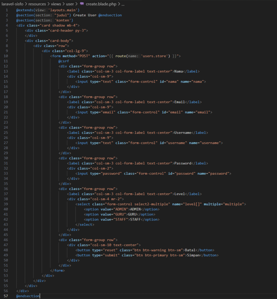 Perintah return view(‘user.create’) artinya menampilkan view create pada folder user, selanjutnya buat folder user di dalam folder view, kemudian tambahkan file create.blade.php dan isikan dengan kode program berikut ini.