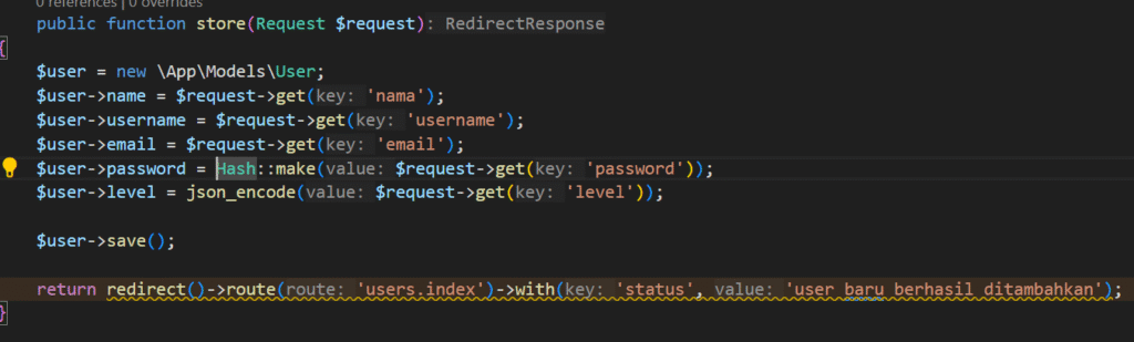 Selanjutnya, buka action store pada UserController kemudian isikan kode program berikut.