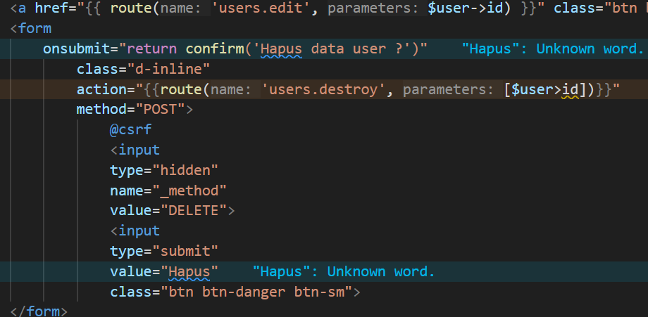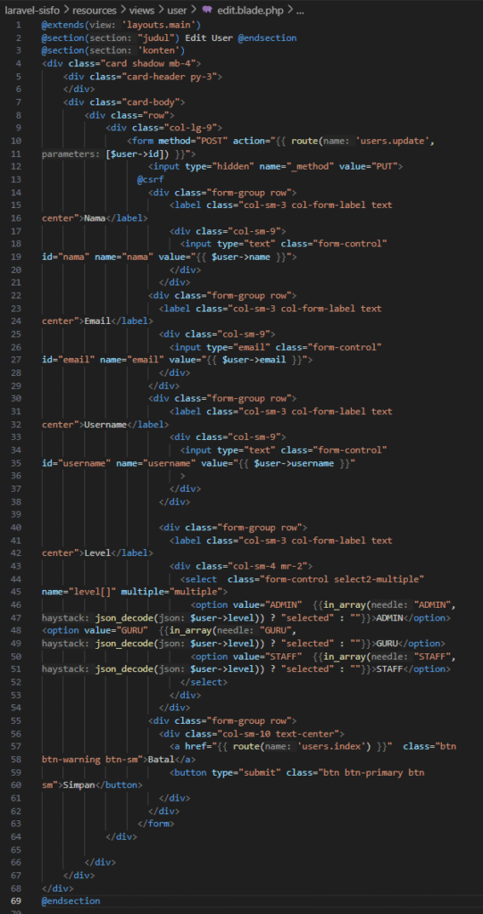 menampilkan form dan menggunakan route users/edit/{user} untuk method PUT. Pertama-tama