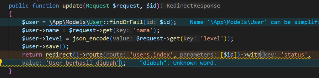 Selanjutnya buka action update pada UserController kemudian isikan dengan kode program berikut ini.